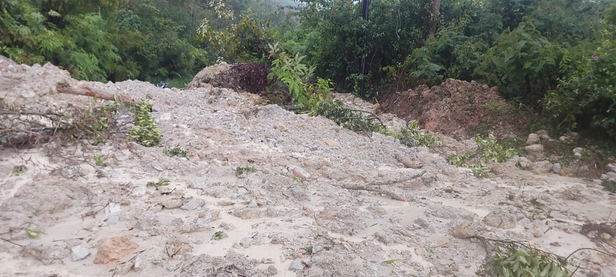 Material tanah dan batu yang turun dari tebing menimbun seluruh badan jalan sehingga arus kendaraan tidak dapat melintas sama sekali.