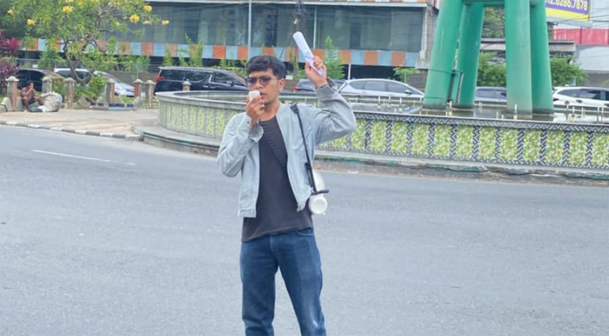 Koordinator Pusat Aliansi Aktivis Kota (AKTA), Ari Gusti, Kamis (16/10) berorasi di salah satu ruas jalan Kota Medan (Foto Is/pnc)
